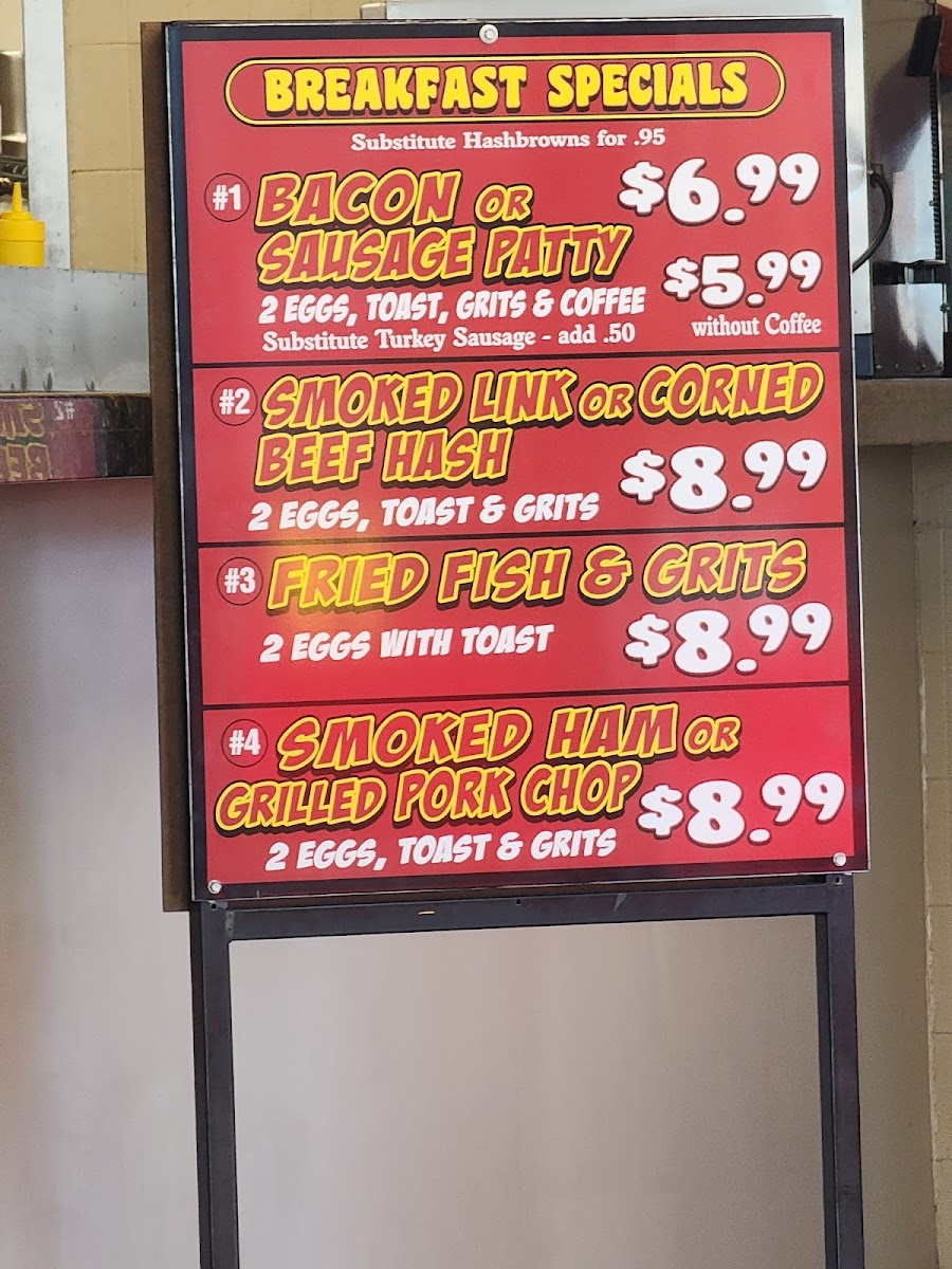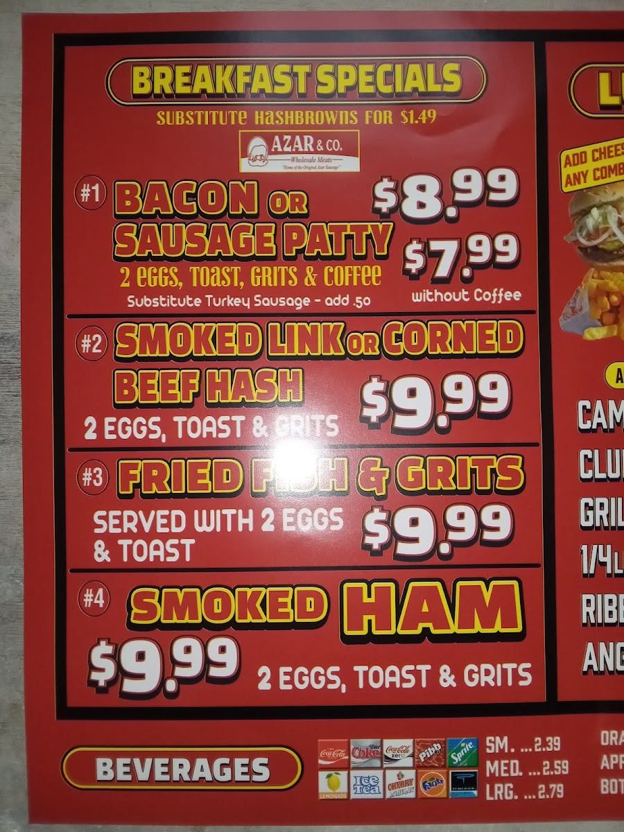 Beverage options primarily include coffee, suitable for breakfast or light meals. Overall, the menu is designed for quick ordering and takeout, accommodating customers looking for efficient service and filling meals.