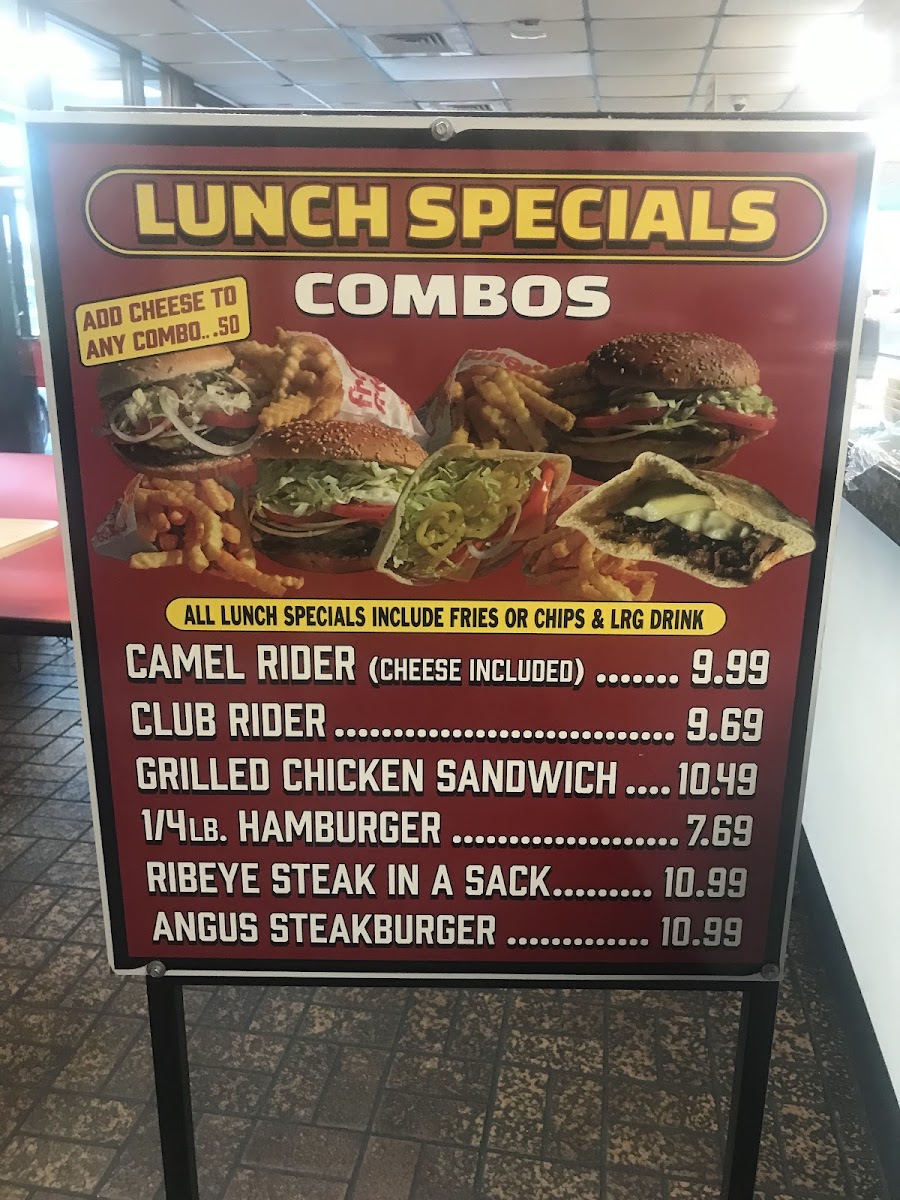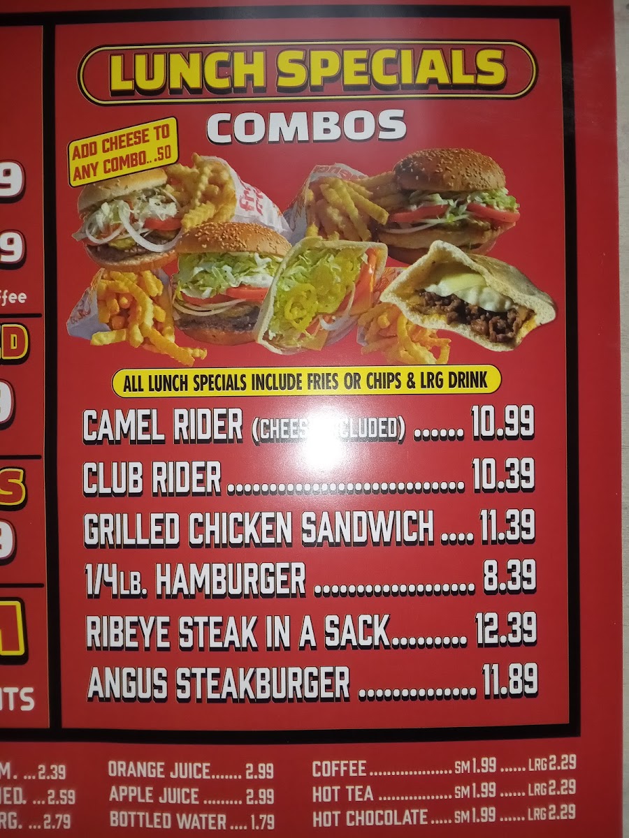 Combo meals provide convenient options that typically include a sandwich, side, and a drink. Available combos include variations such as the Club Rider and the Camel Rider.